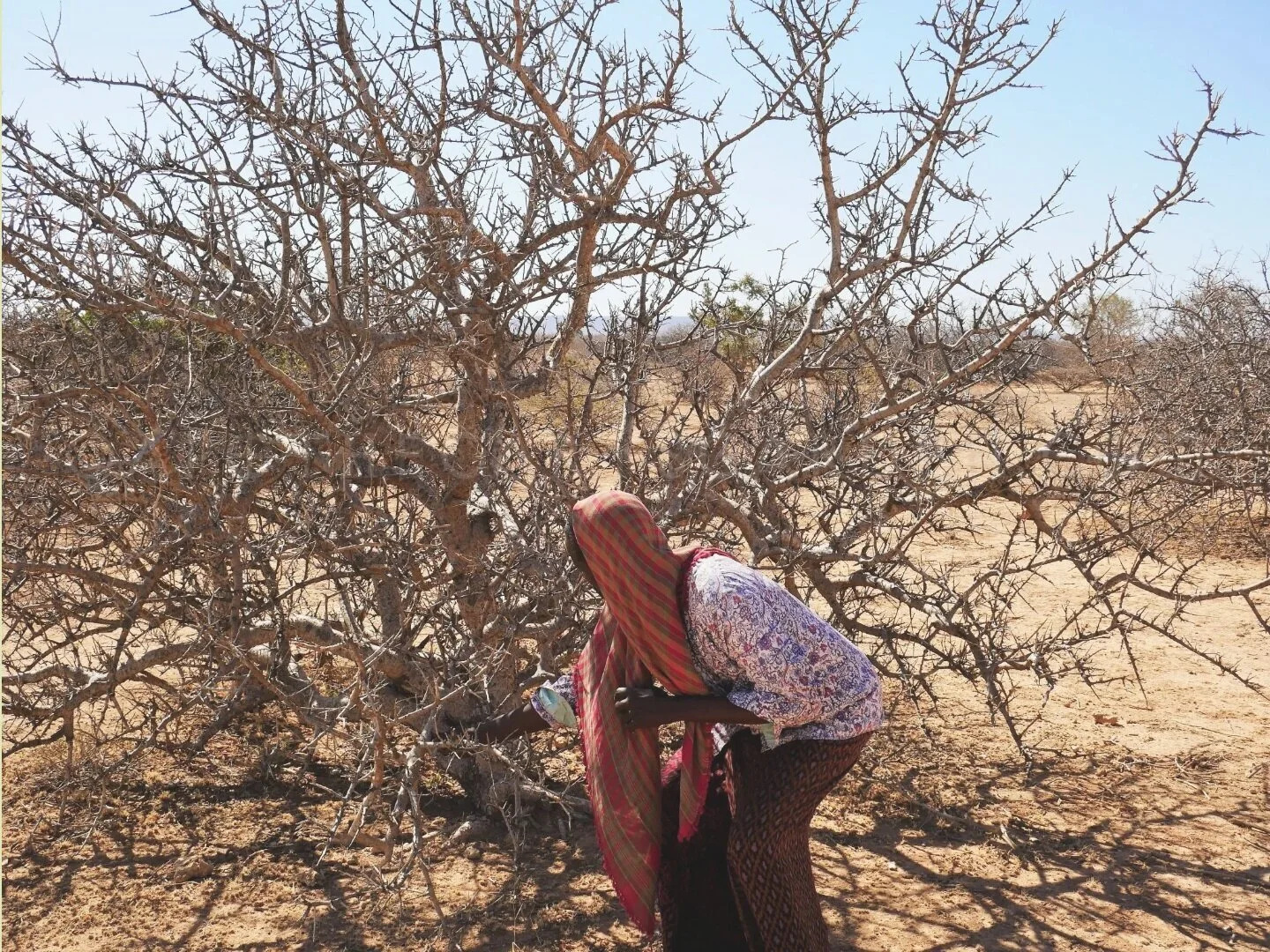 Traditionally, the tree is tapped with a tool called a Mingaaf, with 6-8 cuts only, each summer, for two years, and then the tree rests for one year - so that it can heal and regain its health + strength. When a tree is “tapped” aka cut into, the tree’s immune system sends the sap to the surface to heal its wound. Now, many of the trees are cut continuously with machetes year-round, with up to 100 cuts, and without rest - due to the high demand for this sacred resin. This eventually causes less + low-quality resin and makes the trees vulnerable to be attacked by the longhorn beetle and pathogens that kill the tree completely. Over-harvesting in this way also reduces the germination rate of their seeds and they are unable to reproduce. Some other impacts hurting the trees are insects, wildfires, agricultural encroachment, collection for charcoal, and grazing. This is not only happening in Africa but with the trees in India as well.